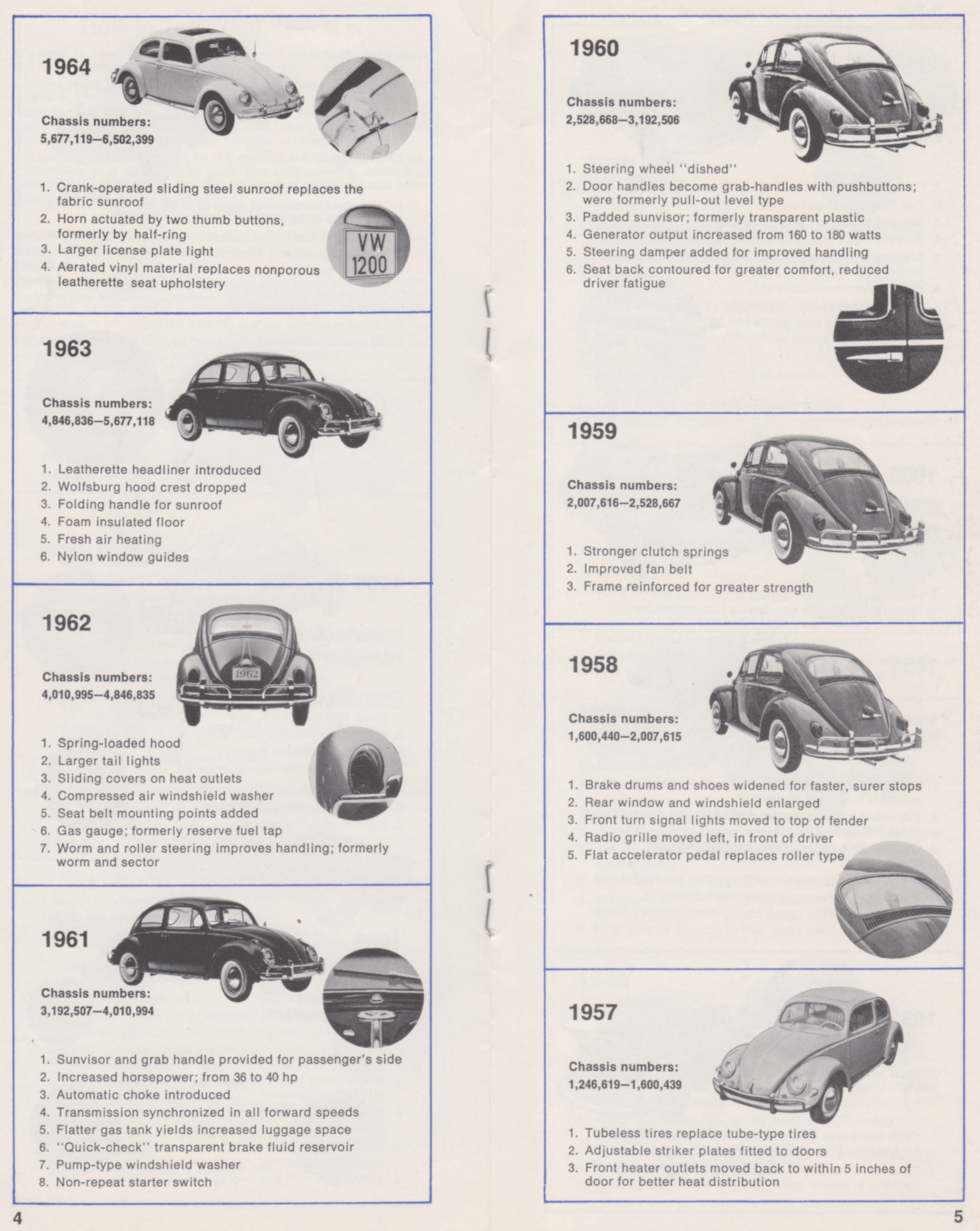 This handy spotter's guide for identifying the vintage of particular VW Beetles was acquired at the time of our parents' purchase of the second of three Beetles. The whole family (5 people) learned to drive from scratch on Beetles with standard transmissions. They were the only vehicle on our family's roster for almost three decades.