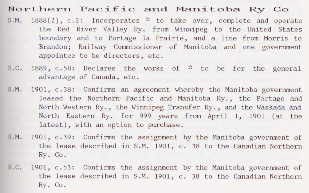 ... but that's still in the future. And it will happen far from Portage. Below is the chain of legislation which shows how the Northern Pacific railway lines were finessed by the NP, CNoR and the Manitoba government into the rapidly-growing Canadian Northern portfolio of western Canadian lines. Oh, to have been a railway builder ... or a corporate lawyer ... back then!