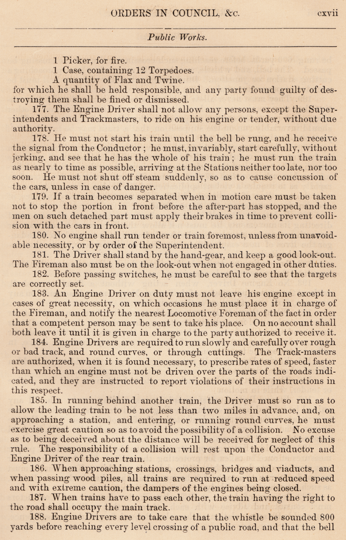 When the country of Canada was 10 years old, this book of Government Statutes and Orders in Council was printed. In it, one can find a fairly complete and detailed description of how early Canadian railway operations were standardized - at least for this well-engineered, well-built and expensive railway which was owned by the Government of Canada.
