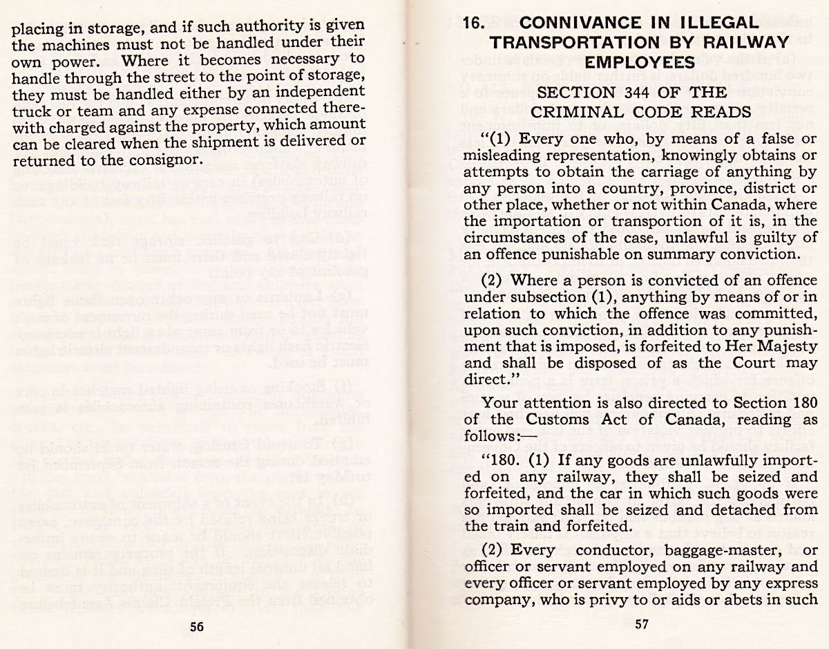 As the railways exited the 'coal age', society was well into the atomic age. Canadian uranium - probably generally shipped as lightly-radioactive ores - was being used to power Canadian nuclear reactors, American reactors and to supplement the eternal vigilance of America's nuclear-armed and atomic-powered armed forces. So four pages are devoted to rudimentary instructions on how to deal with radioactive shipments.